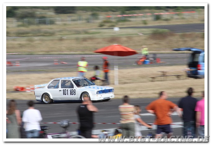 Michael Götz im Opel Kadett C Coupe Platz sechs ging an BMW-Pilot Frank Most, der beide 2400-Meter-Stints mit lediglich fünf Hundertstel-Sekunden-Differenz absolvierte, Endzeit 191,15 Sekunden. Eine halbe Sekunde schneller war Günter Fertig im Kadett Coupe , danach gab es heftige Diskussionen Pylonenfehler oder nicht, die Streckenposten hatten jedenfalls keinen auf der Liste, der Fahrer des MSC Röhn somit fünfter. Eine Kadett C Limousine auf Rang vier, Sven Schill vom AC Kaiserstuhl, dessen Bruder Daniel musste mit demselben Flitzer mit Platz elf vorlieb nehmen. Auf dem Podest zwei BMW’s und ein Opel. Reinhard Nuber im Training mit der zweitschnellsten Zeit aber einem Hütchen, der 320i WTCC dann im ersten Stint fehlerfrei aber etwas langsamer 93,99 Sekunden. Junior Patrick Orth wie immer im Training „über“ dem Limit beim Ausloten was geht, diverse Pins, dann Räder wechseln und im ersten Lauf 93,17 – fehlerfrei. Einer konnte es aber schneller, und zwar deutlich schneller. Nachdem Lars Heisel schon aus dem Training mit 92,12 zurückgekommen war, donnerte der frühere Bielefelder und jetzige Freisinger mit fehlerfreien 91,33 Sekunden um den Parcours.„Grenzwertig“ so seine Aussage, das war absolutes Limit. Lars konnte im zweiten Stint etwas Druck herausnehmen, seine 92.04 vom Rest des Feldes immer noch unerreicht, der Fahrer des Teams Scuderia Süd scheint seit Mainbullau wieder mit dem Böhm-Kadett eine traumhafte Einheit –sprich „Eins zu sein“ , da passt rundum alles perfekt. Endzeit 183,37, Klassen-, Gruppen-, und Gesamtsieg. Schon 3,4 Sekunden – „Welten“ im Slalomsport - zurück Patrick Orth, der im zweiten Stint nicht zulegen konnte, sondern eine halbe Sekunde verlor, Klassen-, und Gesamtzweiter im BMW 320 is. Auch der Allgäuer Reinhard Nuber wollte im zweiten Lauf nochmals angreifen, andere Räder waren montiert, aber das Gegenteil traf ein, Reinhard wurde einen Sekunde langsamer, schlussendlich Klassen-, und Gesamtrang drei in 188,89 Sekunden.